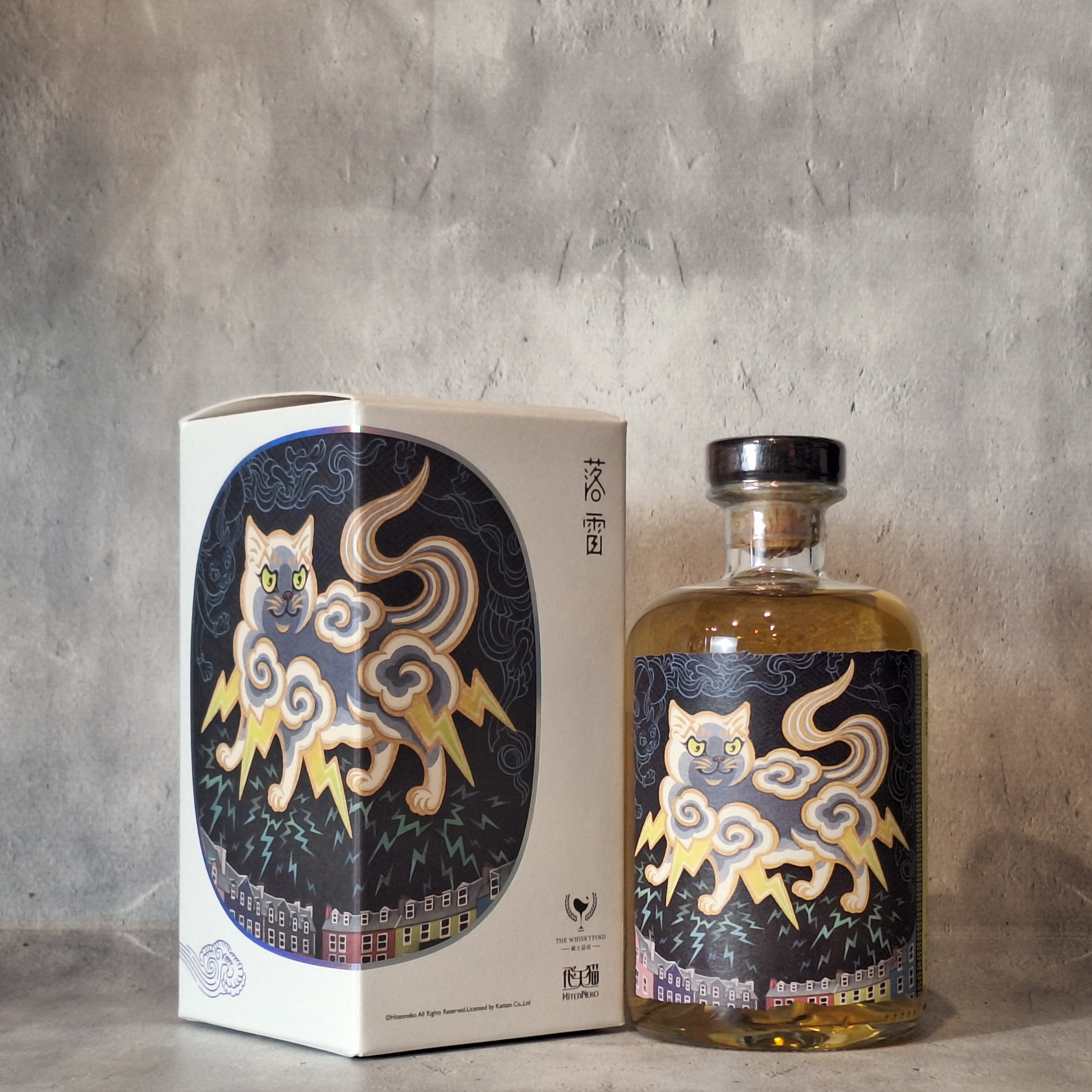 「飛天」とは仏教美術(敦煌の壁画など)に描かれる天女のような存在で、天からの祝福を意味します。ウイスキー蒸留所の守り神でもある「猫」をこの飛天に見立て、「現実世界に生命の水(ウイスキー)と祝福を運んでくる、いたずら好きな使者」として描いたのがこのシリーズです。