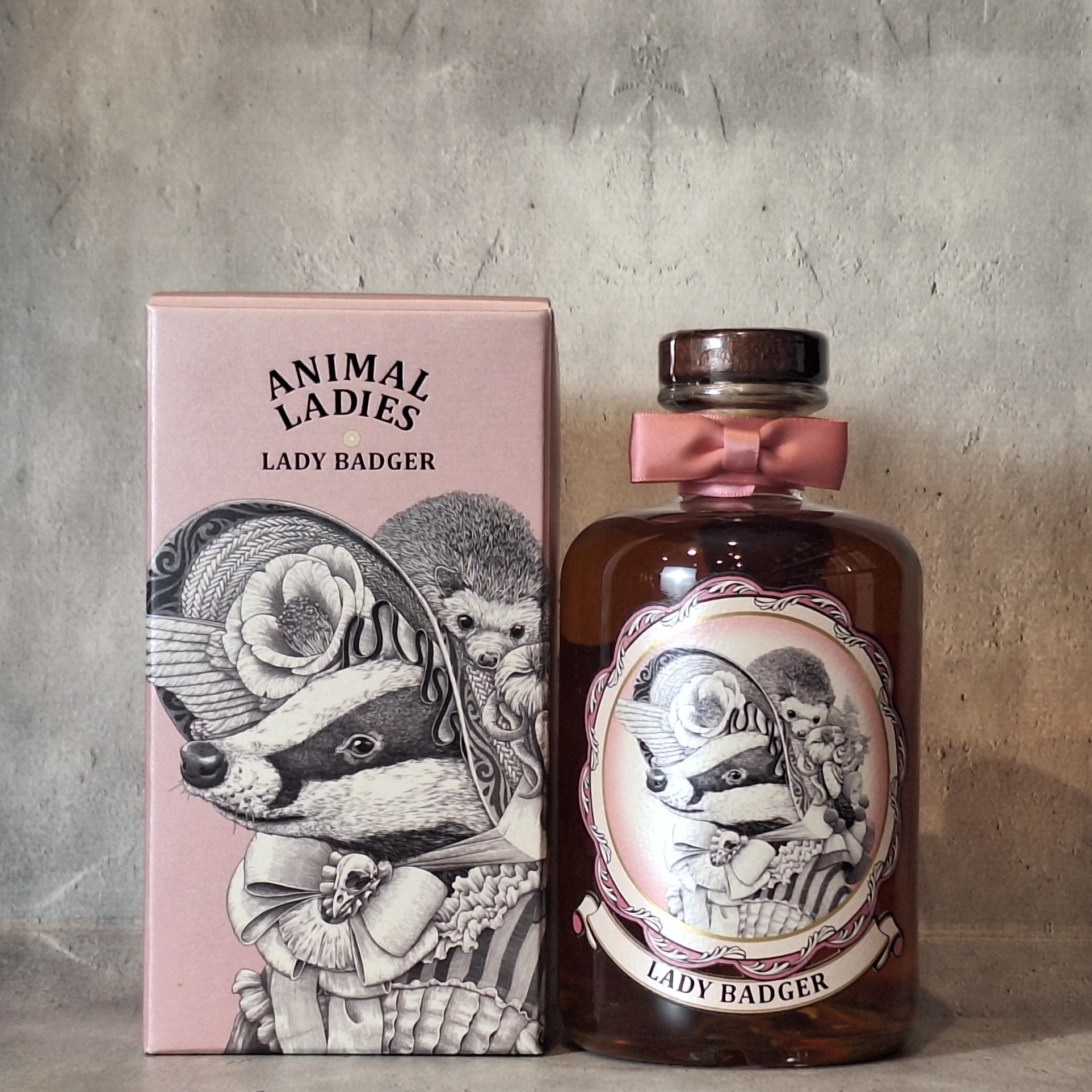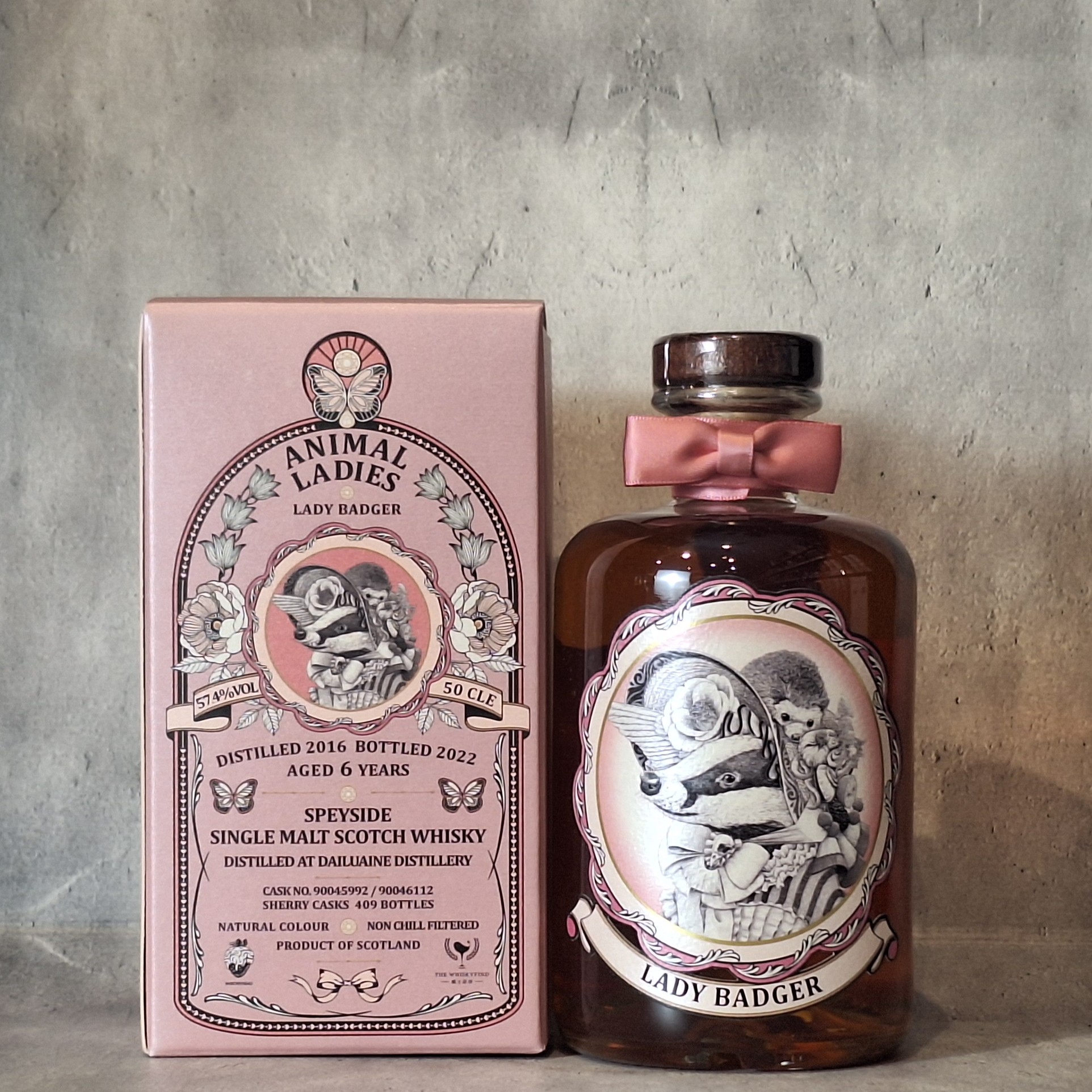 アナグマ(Badger)は、ダルユーイン蒸留所近くの森に生息しています。彼女が被っている帽子には、アナグマの好物であり、このウイスキーのフレーバーでもあるベリー、パイナップル、イチジクなどがデコレーションされています。